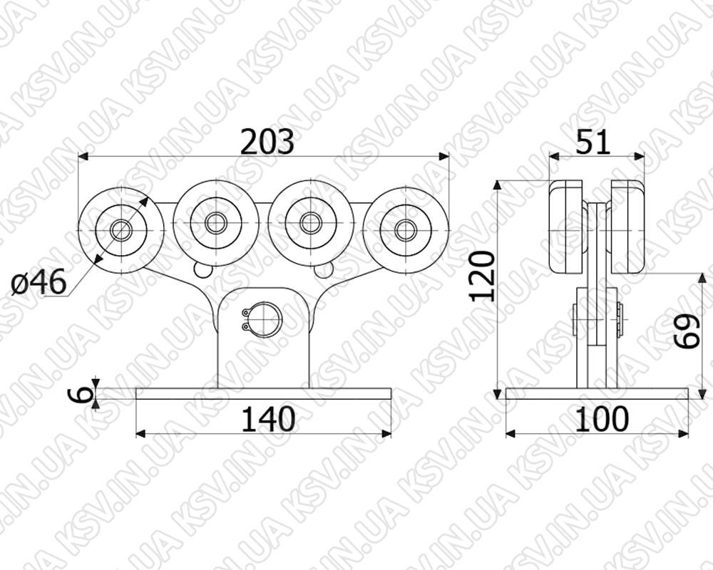 Роликова каретка несуча з ПОЛІМЕРНИМИ РОЛИКАМИ сумісна з балкою 69×58, що несе, використовується для виготовлення максимально тихих відкатних воріт і зсувних конструкцій з вагою до 400 кг.