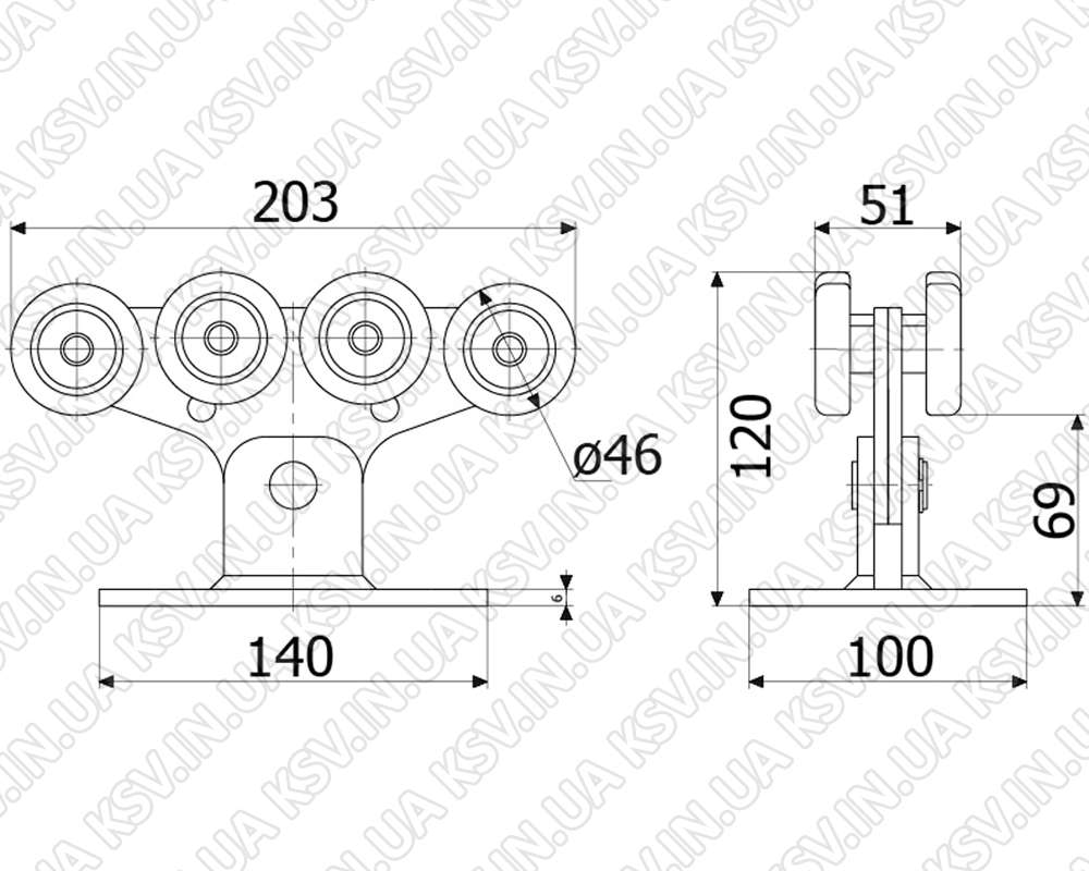 Роликова каретка, що несе зі сталевими роликами на 201 підшипнику, сумісна з балкою 69×58 і 70×58, що несе, використовується для виготовлення відкатних воріт і зсувних конструкцій з вагою до 400 кг.