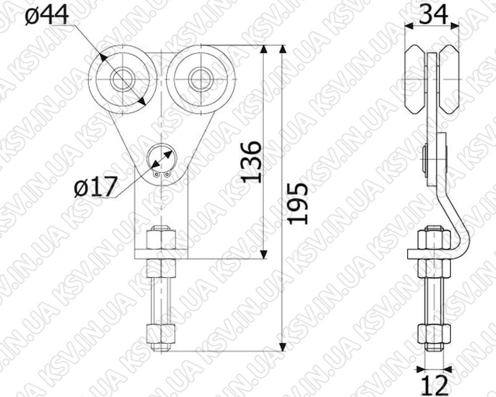Спеціальна роликова каретка СТРІКС С2 зі сталевими роликами на 201 підшипнику, сумісна з напрямною СТРІКС середньою 42×54, використовується для виготовлення підвісних воріт, зсувних конструкцій з вагою до 300 кг.