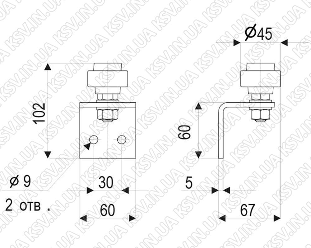 Обмежувач U складається з оцинкованого кронштейна і направляючого ролика діаметром 45 мм. За цим роликом переміщається напрямний профіль U. Даний обмежувач призначений для виготовлення відкатних, підвісних воріт та конструкцій з вагою до 500 кг
